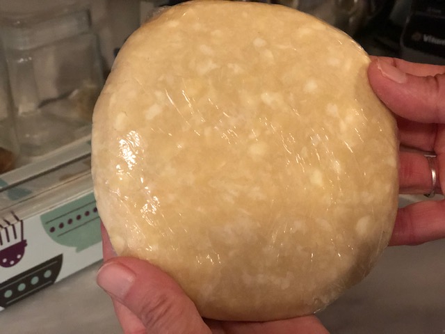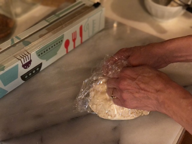 Bring up the sides of plastic wrap to smoosh the dough together, shaping it into a round disc.