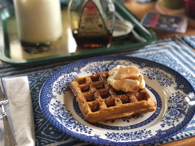 **For spiced pumpkin waffles, add 1/2 cup pumpkin purée to the wet ingredients, and 1 teaspoon cinnamon, 1 teaspoon ginger, and 1/8 teaspoon allspice to the dry ingredients before blending. Really yummy!