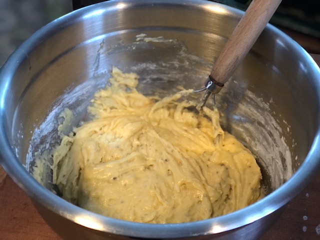 - With a wooden spoon or danish whisk, stir the flour into the egg mixture little by little, maybe a cup at a time. Keep adding flour until all of it is incorporated. Do not over mix.