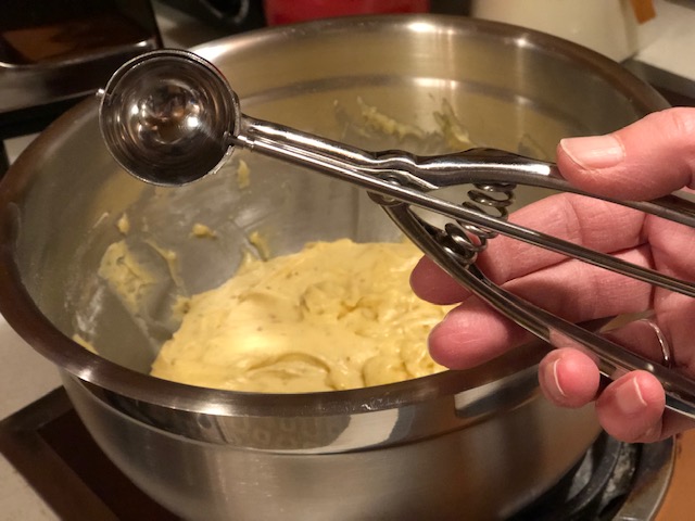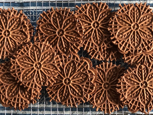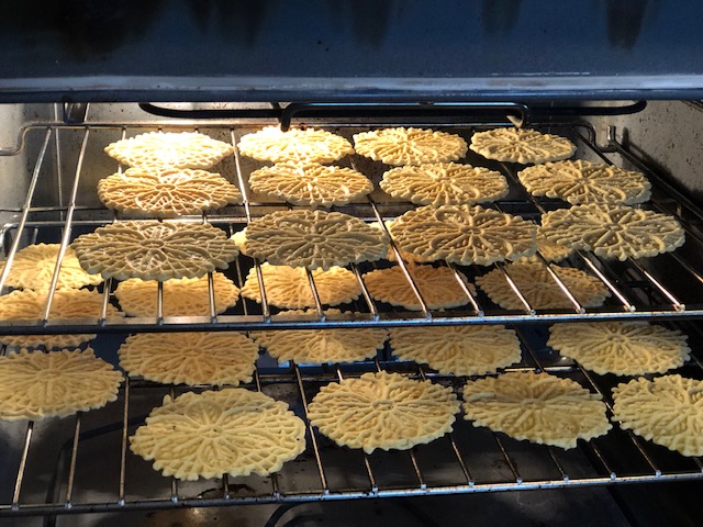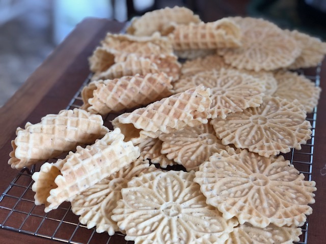 - When ready to get started, preheat your pizzelle iron for at least 15 minutes to make sure it is evenly heated. Once preheated, brush lightly with oil. You will only do this once. Place a 1 tablespoon dollop of batter in the center of each pizzelle pattern on the iron (I use a one-tablespoon cookie scoop and it works really well). You can place the dollop slightly back of center to try to get the cookies to be well centered once flattened. After a couple of tries, you will find what works best. Close the iron and bake for 40 to 60 seconds, or until the pizzelle are a light golden color. You’ll need to practice a little to get them just the way you like them. Remove using a thin plastic or bamboo knife to get under the edge, and let cool completely on a cooling rack (no overlapping). For consistent results, close the iron and let it come back to temp every time; this only takes a minute or less, so it’s worth it. Store pizzelle in an airtight container. These keep well for up to a month, if they last that long. The flavor and texture improve as they age. Serve with your favorite hot beverage or ice cream.