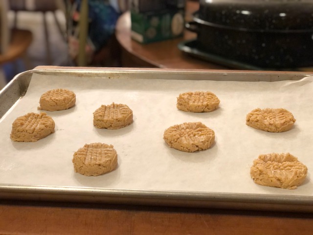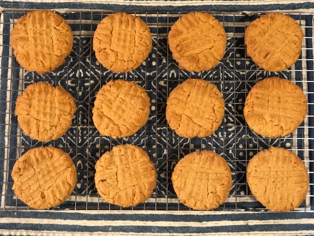 I followed the recipe (aside from the slight reduction in peanut butter), including sifting the flour before measuring. I weighed the flour after sifting and measuring it, and ended up with 200 grams of all-purpose flour. I also skipped the vanilla by mistake, and decided the cookies didn’t need the vanilla. The only other change I made was adding more salt to the recipe. I more than doubled it! I kept tasting the dough and found it was too sweet, so I kept adding salt until it tasted yummy. I may have needed to do this because of using unsalted butter, but who knows? Jacques Pépin says to always taste your food as you prepare it, and who am I to argue with Jacques Pépin?