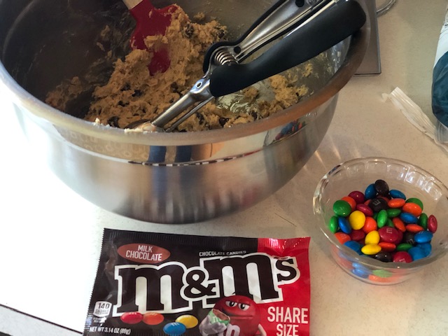 So we got to work. Turns out that in addition to M&M’s, these cookies have oats and peanut butter in them, as well as regular chocolate chips… they are filled with all the things. We did a little research, and decided to use this recipe. Mara suggested we put some M&M’s on top of each cookie before we bake them, to make them look extra pretty, which I thought was a great idea. They were a big hit with Mara’s friend, so it was perfect.