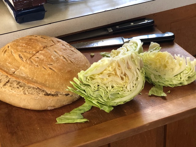 - 1 medium head of green cabbage, thinly sliced (maybe eight cups or so)