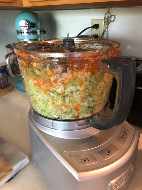 - Using a food processor or a sharp knife, slice cabbage finely, and peel and shred carrots with the larger holes on shredder. You want to end up with about 8 cups, more or less.