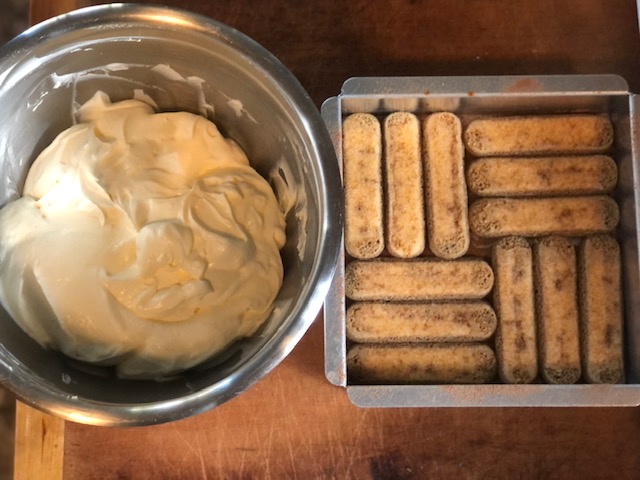 5. Dip ladyfingers lightly, one at a time, in the coffee/rum mixture, and make a single layer of them in the cake pan, rounded side up. Only use half of the ladyfingers (12), breaking some into smaller pieces to get them to fit. Cover the ladyfingers with half of the cream filling, then repeat the dipping of the remaining ladyfingers and cover with the rest of the cream. Dust with 1 tablespoon cocoa.