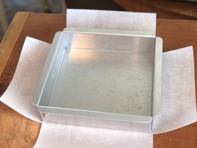 1. Line an 8″ x 8″ square cake pan with parchment paper, making sure there is overhang for easy lifting. Set aside.