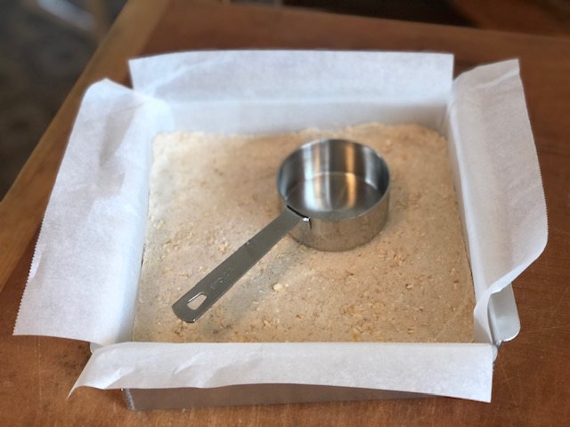 3. Put 2/3 of the crumb mixture (about 3 cups worth, or 400 grams) into your prepared pan. Spread the crumb evenly, and press it down firmly either with your fingers or the back side of a measuring cup. Place the pan/crust into your freezer for 30 minutes. Put the remaining crumb mixture in the fridge. Go check your email or have a cup of tea.