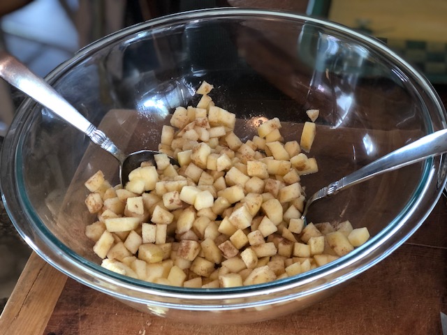 5. While the crust is baking, peel, core and dice your apples into 1/2″ cubes. Toss with 2 tablespoons sugar and 2 dashes cinnamon. You don’t want to overdo it with the cinnamon, because you want the apples to taste like apples!
