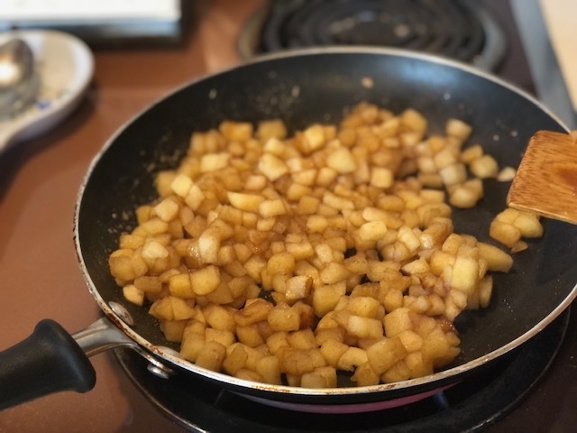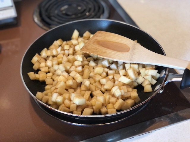 6. In a medium (10 inch) non-stick saucepan, saute the prepared apples on medium-high heat, stirring often. You will see a lot of juice at first. Keep cooking and stirring until you no longer see any juices, and the apples have darkened. Some might even have started to caramelize. This might take 8 to 10 minutes, give or take a few. Just keep an eye on them. You don’t want them to burn!